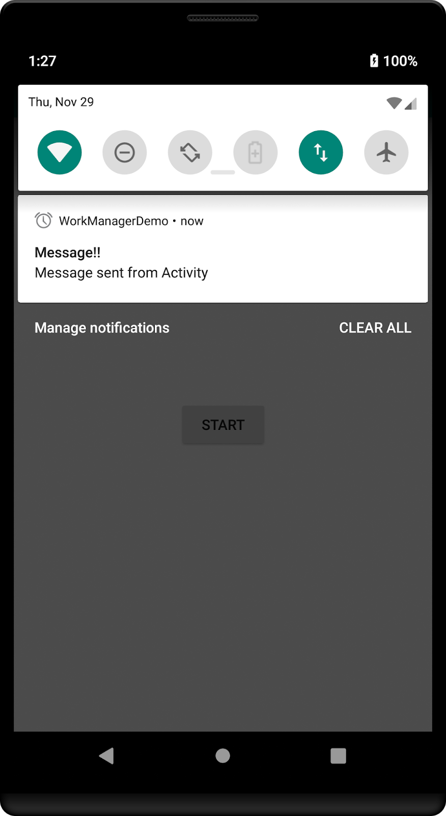 import android.R import android.app.NotificationChannel import android.app.NotificationManager import android.content.Context import android.support.v4.app.NotificationCompat import androidx.work.ListenableWorker import androidx.work.Worker import androidx.work.WorkerParameters class FirstWorker(context: Context, workerParams: WorkerParameters) : Worker(context, workerParams) { val mContext = context override fun doWork(): ListenableWorker.Result { sendNotification() return ListenableWorker.Result.SUCCESS } fun sendNotification() { val notificationManager = mContext.getSystemService(Context.NOTIFICATION_SERVICE) as NotificationManager val channelId = "WorkManager_02" //If on Oreo then notification required a notification channel. if (android.os.Build.VERSION.SDK_INT >= android.os.Build.VERSION_CODES.O) { val channel = NotificationChannel(channelId, "WorkManager", NotificationManager.IMPORTANCE_DEFAULT) notificationManager.createNotificationChannel(channel) } val notification = NotificationCompat.Builder(mContext, channelId) .setContentTitle("WorkManager") .setContentText("Message from First Worker!!") .setSmallIcon(R.drawable.ic_lock_idle_alarm) notificationManager.notify(3, notification.build()) } }